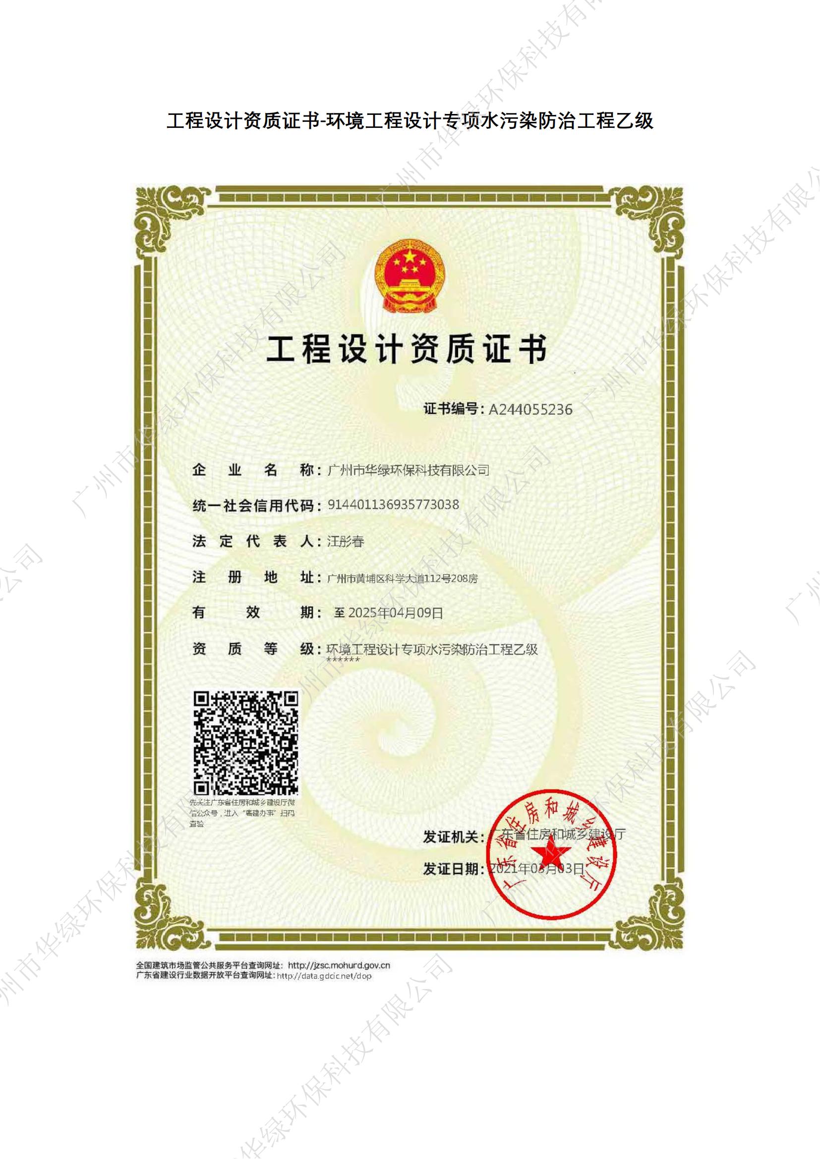 工程設(shè)計(jì)資質(zhì)證書-廢水治理乙級